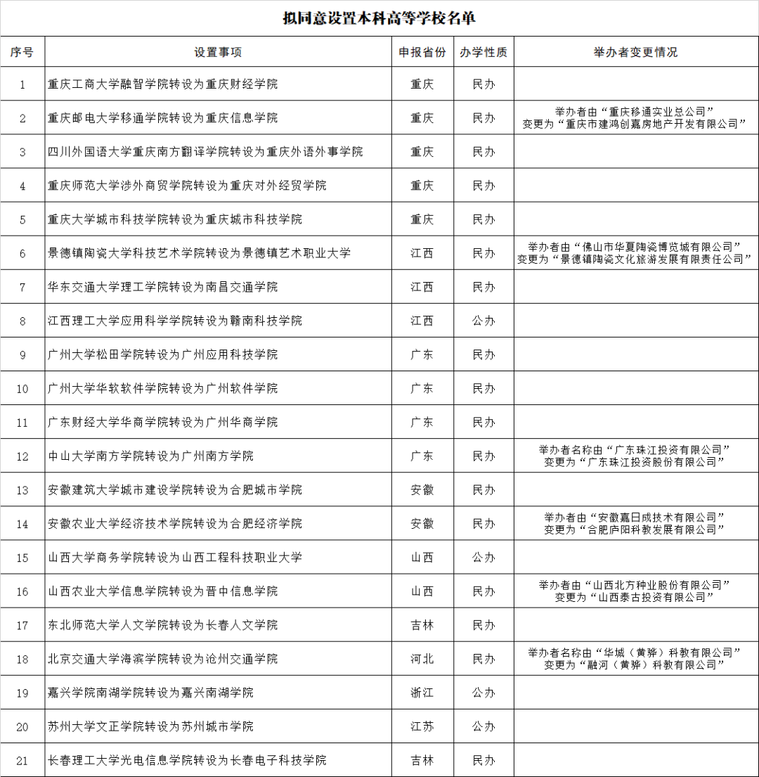 根据《高等教育法》《普通高等学校设置暂行条例》《普通本科学校设置暂行规定》和《关于加快推进独立学院转设工作的实施方案》等法律法规政策规定,经第七届全国高等学校设置评议委员会专家考察和评议,并经党组会审议,拟同意重庆工商大学融智学院等21所独立学院转设为独立设置的本科学校,现将学校名单等信息向社会公示。