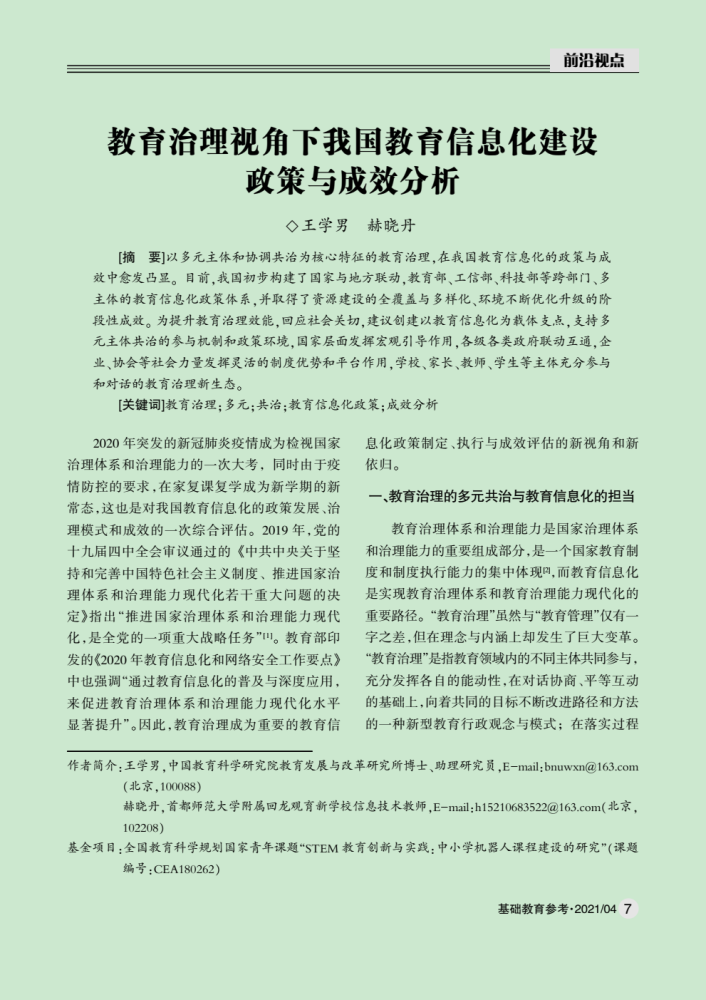 2019 年,国务院印发 《中国教育现代化2035》,作为政策的顶层设计,以深化推进各级各类教育的普及与公平为经度,以教师队伍建设、教育信息化、教育国际化等为纬度,全方位推进教育现代化的总体目标,并努力形成全社会共同参与的教育治理新格局。