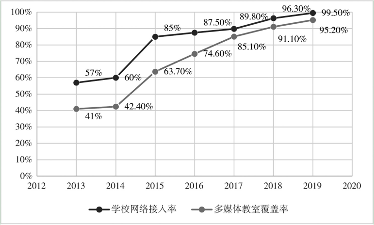 为不断缩小区域间教育发展的差距,通过专项资金资助偏远地区进行学校改造及联网攻坚行动取得了较好进展,许多乡村学校的办学条件得到改善。截至 2019 年 9 月,全国中小学(除教学点外)中,99.5%的学校实现了网络接入,配备多媒体教学设备普通教室 359 万间;95.2%的学校已拥有多媒体教室,其中 75.9%的学校实现了多媒体教学设备全覆盖[4] (见图 1)。