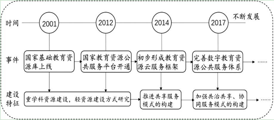 自 2001 年以来,数字教育资源公共服务体系经历了从初步形成到不断调整,再到日渐完善的发展过程。2001 年,国家基础教育资源库的上线,标志着我国数字教育公共服务体系的初步形成,也为数字教育资源公共服务体系的建立奠定了基础[5]。