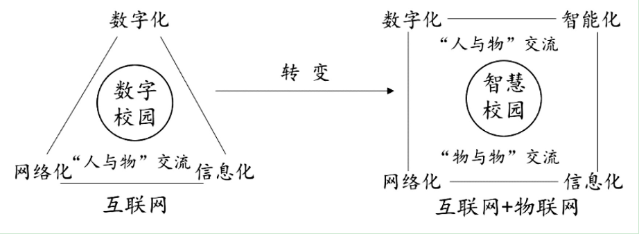 从数字校园到智慧校园的转变过程中,设计理念发生了变化,建设任务也有所不同。数字校园的建设聚焦于管理与教学的信息化、网络化和联通化,最主要的突破在于实现了人与物之间的交流,从而实现了全面数字化,避免了学校各部门之间形成“信息孤岛”(见图 3)。智慧校园则重在将学校中的教学和管理从数字校园的基础上向智能化发展,在互联网的基础上延伸到物联网,不仅有人与物之间的交流,也有物与物之间的互动,以全面实现校园中的万物互通互联,逐步形成可感知、协作型、一体化、可预测等优势。