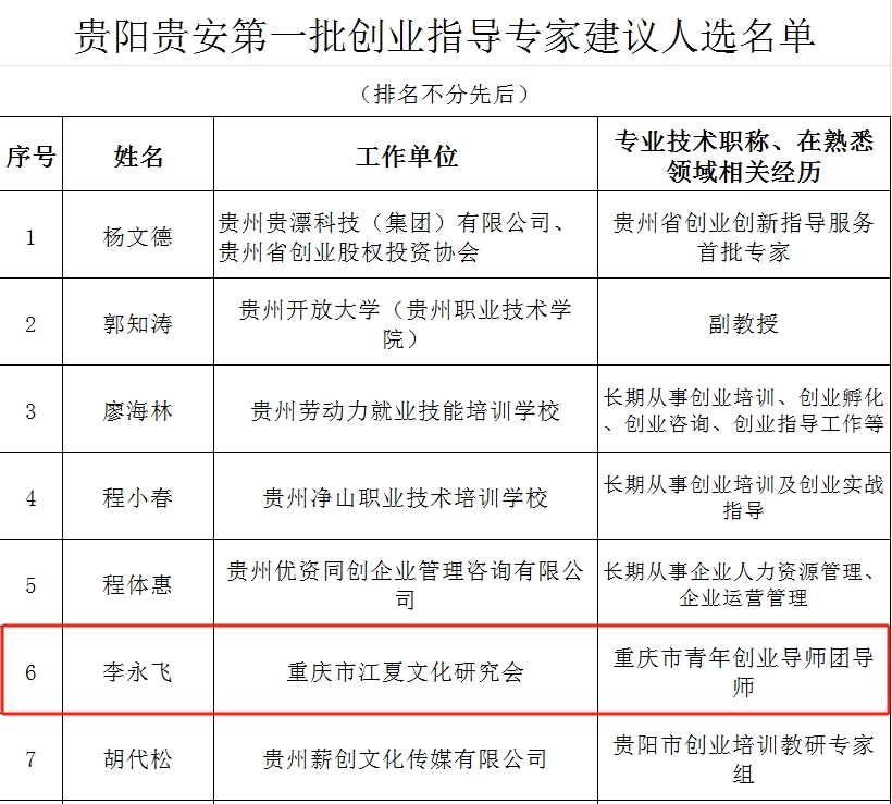 日前,经多个程序严格审核、评审,贵阳市人力社保局发布了贵阳贵安第一批创业指导专家名单,重庆考神教育科技集团有限公司董事长、考神教育集团贵州教学服务中心董事长、重庆市江夏文化研究会党支部书记、常务副会长兼秘书长李永飞被聘为贵阳贵安创业创新指导服务专家,聘期三年。